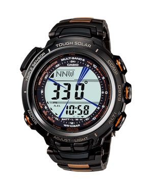 | PROTREK最高峰「MANASUL」のバーゼル発表モデル。ベゼル・サイドボタン・フロントボタン・バンドにブラックIPを施し、中駒にカッパーIPを施したバイカラーバンド、サイドボタン・色埋めにはオレンジを配色、ELバ... |